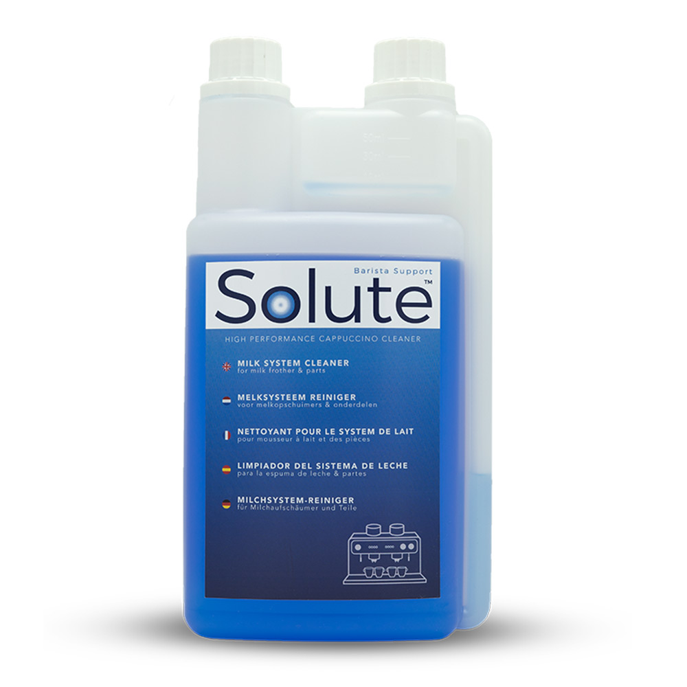 Solute melksysteemreiniger, 1 liter, is ontwikkeld voor het grondig reinigen van het melksysteem van volautomaten, stoompijpjes, melkkannetjes, opschuimers, slangen en koppelstukjes. De Solute melksysteemreiniger zorgt voor een optimale reiniging en lost op hygiënische wijze vastzittende melkresten en eiwitten moeiteloos op. De melkreiniger is zowel koud als warm te gebruiken.