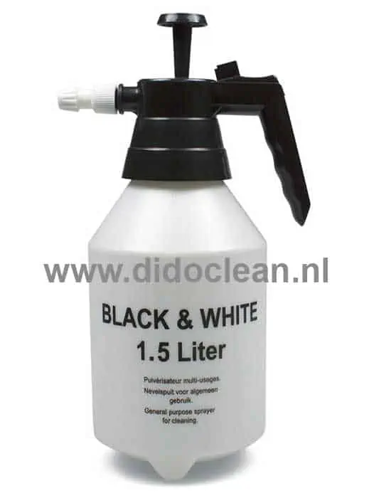 De Sprayflacon Black & White 1,5 l met drukpomp voor de professional. De sprayflacon heeft een drukpomp waarmee u de flacon onder druk kunt zetten. U bedient de Sprayflacon Black & White vervolgens met de knop op het handvat. De sproeikop is regelbaar van nevel tot rechte straal.
