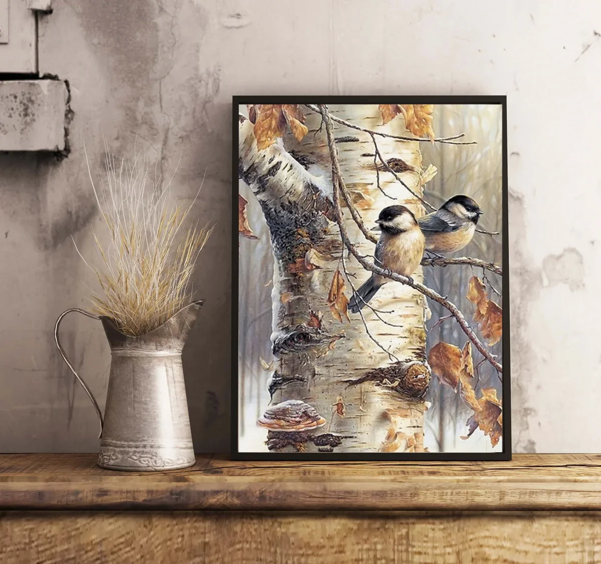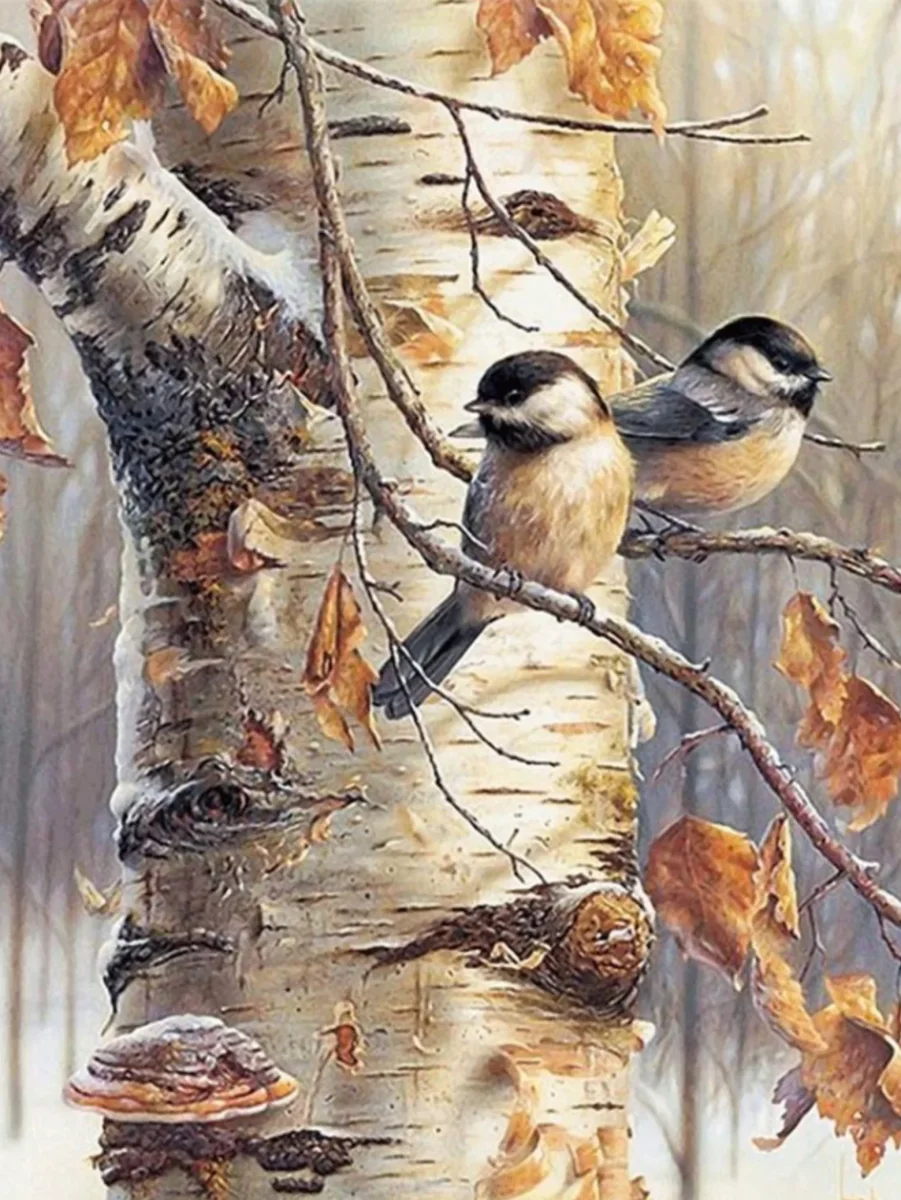 Twee schattige vogeltjes rusten op een berkenboom, omringd door warme herfstkleuren 🍂 en een vleugje magie ✨.