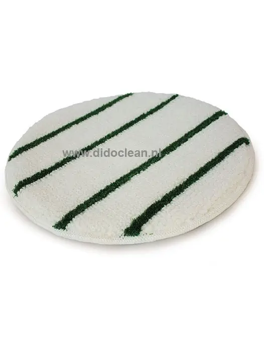 Tapijt reinigingspad Tapijt bonnet pad 17 inch groen/wit voor het reinigen van tapijt en vloerkleden. Gemaakt van gelust wit polyamide met groene scrubstrepen. De polyamide microvezel neemt moeiteloos het ingetrokken vuil op terwijl de scrubstrepen het vuil eerst los schrobben. Voor gebruik op oppervlaktes met medium vervuiling. Wasbaar tot 60°C.