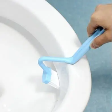 Een beetje Toiletreiniger onder rand van het toilet spuiten en even laten inwerken. Vervolgens de borstel onder de rand steken en een paar keer rondom bewegen.