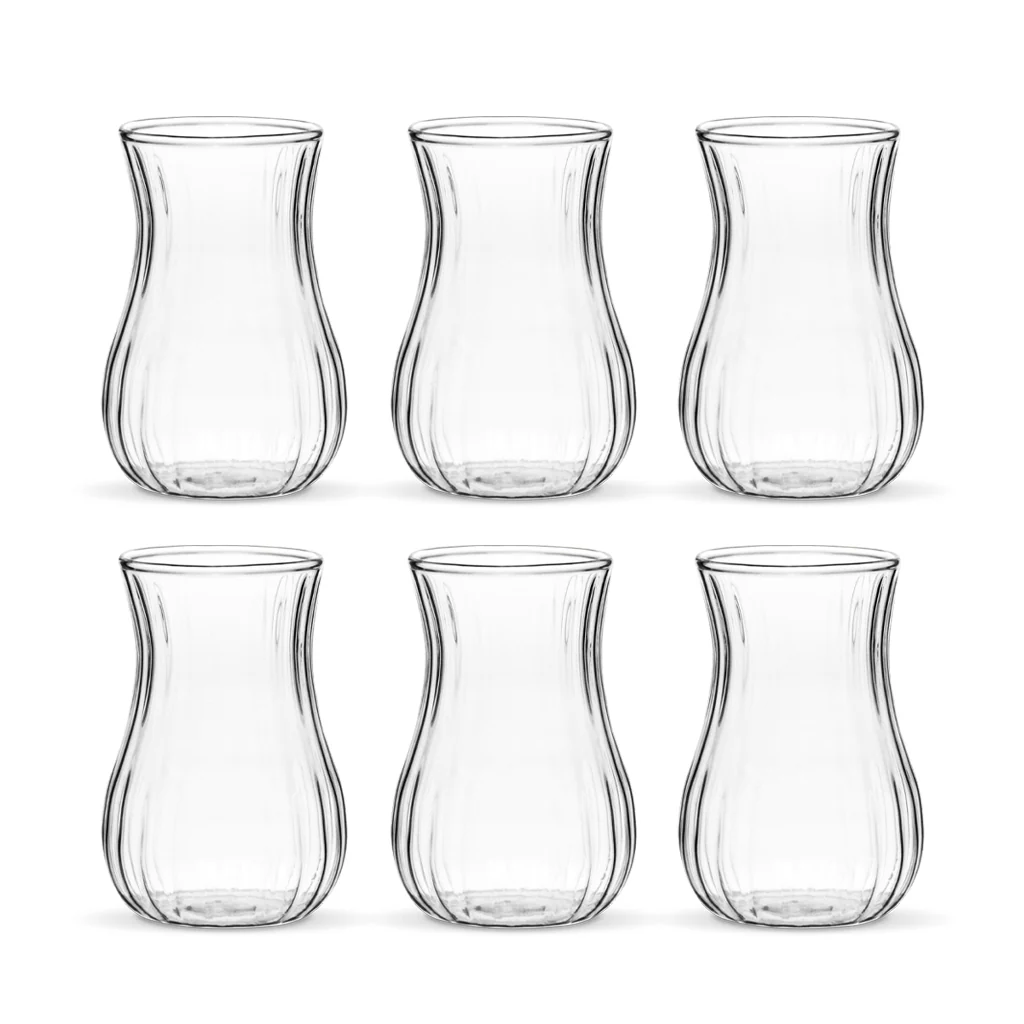 Deze Trendy Linea Turkse theeglazen van 180 ml zijn gemaakt van hoogwaardig borosilicaatglas en combineren een traditionele vorm met een modern, ribbel ontworpen silhouet. Dankzij het hittebestendige glas blijven warme dranken langer op temperatuur en blijft het glas prettig vast te houden. De elegante bolling zorgt voor een optimale smaakbeleving, waardoor deze glazen ideaal zijn voor Turkse thee en dagelijkse theemomenten. De set bestaat uit zes duurzame glazen die licht van gewicht zijn, helder blijven na veelvuldig gebruik en geschikt zijn voor zowel thuisgebruik als professioneel gebruik