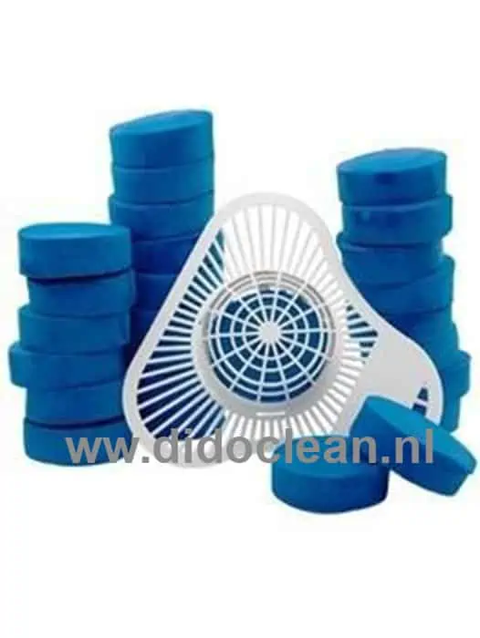 Urinoirrooster inclusief Bio-Block urinoirblok voor een fris ruikend urinoir. Dit universele urinoirrooster past in nagenoeg elk urinoir. Op het urinoirrooster is een wit korf bevestigd waarin een Bio-Block urinoirblok is geplaatst. Het Bio-Block urinoirblok is een extra groot urinoirblok en geschikt voor 5000 spoelbeurten en geeft een frisse citroengeur.