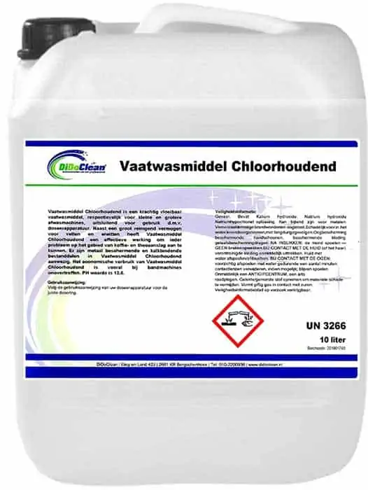 Vaatwasmiddel Chloorhoudend 10L Vloeibaar is een krachtig vaatwasmiddel voor professioneel gebruik. Geschikt voor kleine en grotere afwasmachines in combinatie met doseerapparatuur. Naast een groot reinigend vermogen voor vetten en eiwitten heeft het een effectieve werking om ieder probleem op het gebied van koffieaanslag of theeaanslag aan te kunnen. In DiDoClean Vaatwasmiddel Chloorhoudend zijn metaal beschermende en kalk bindende bestanddelen toegevoegd ter bescherming van uw apparatuur. PH waarde 13,5