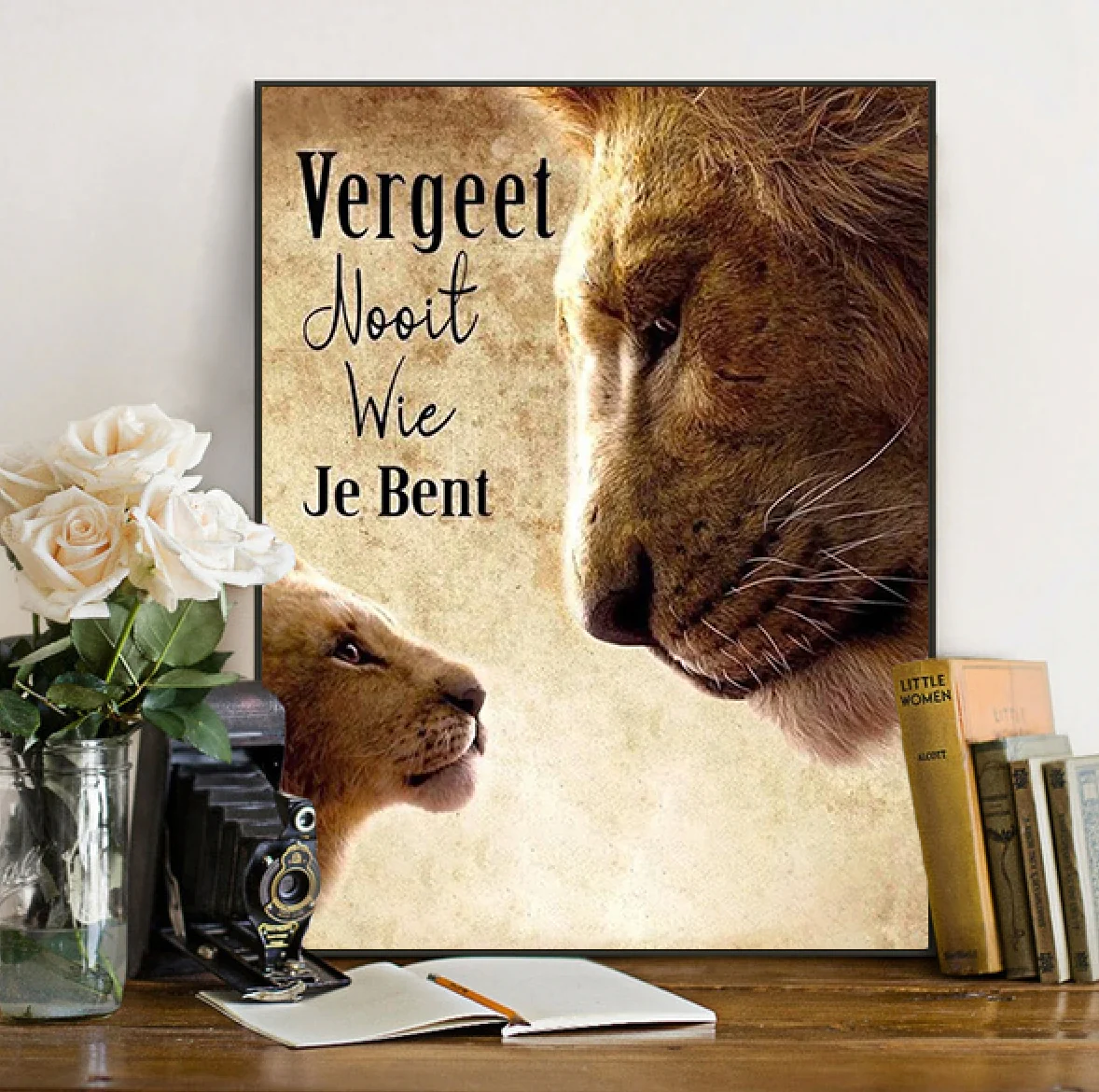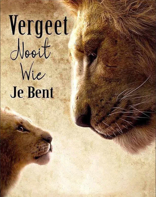 🦁 Een krachtige en ontroerende afbeelding van een jonge leeuw die vol bewondering opkijkt naar een majestueuze volwassen leeuw. De warme kleuren en diepe symbolieke tekst maken dit tot een indrukwekkende diamond painting vol kracht, liefde en identiteit.