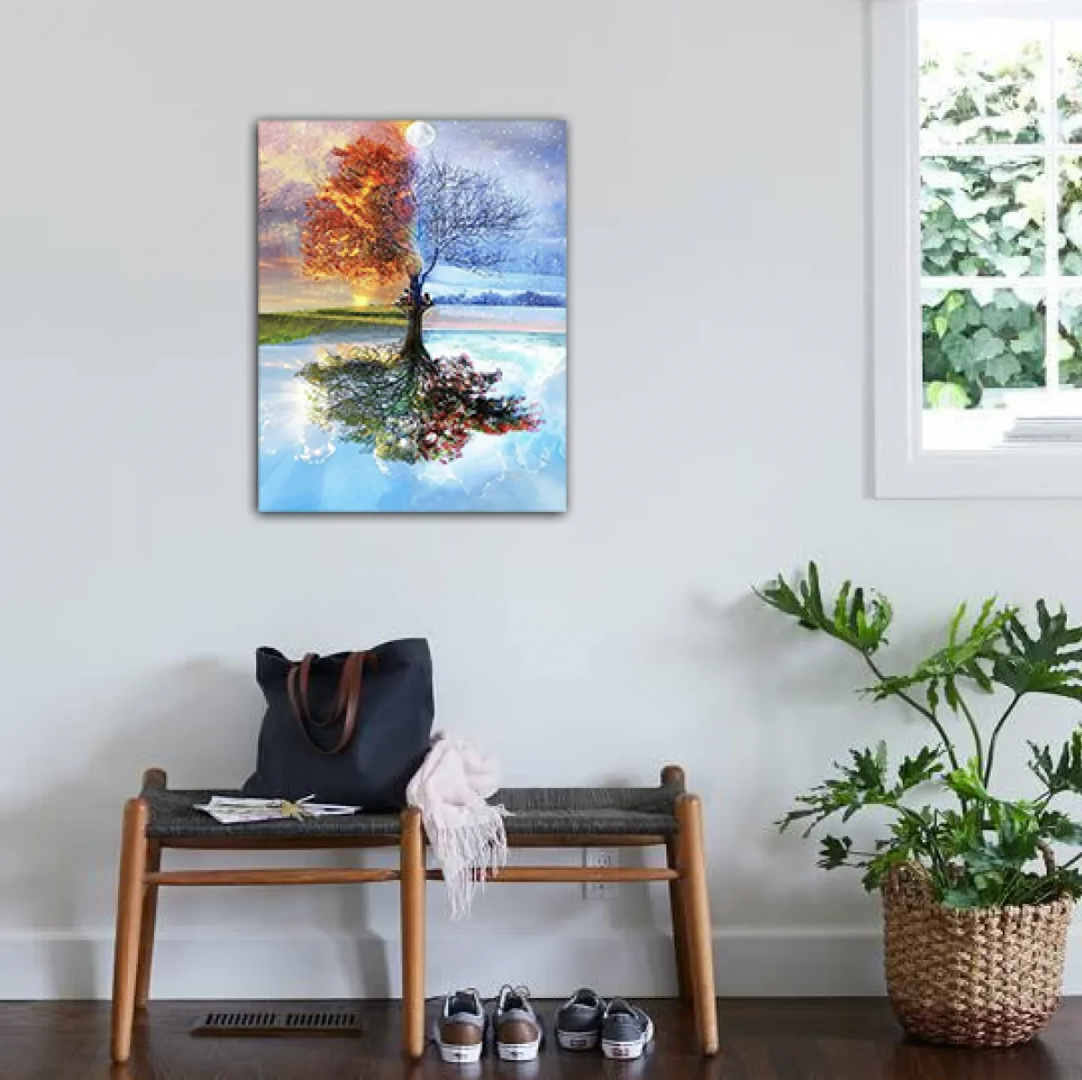 Een magische boom die alle vier de seizoenen in één beeld vangt 🌈. Links gloeit de herfst met vurige oranje bladeren 🍁, terwijl rechts de winter zijn ijzige takken toont onder een sterrenhemel ❄️🌙. Onder de boom weerspiegelt het landschap in een serene spiegeling – een hemelse mix van lente en zomer 🌷☀️. De overgang van warm naar koud, van dag naar nacht, maakt dit beeld een krachtig symbool van de cyclus van het leven 🌍✨.
