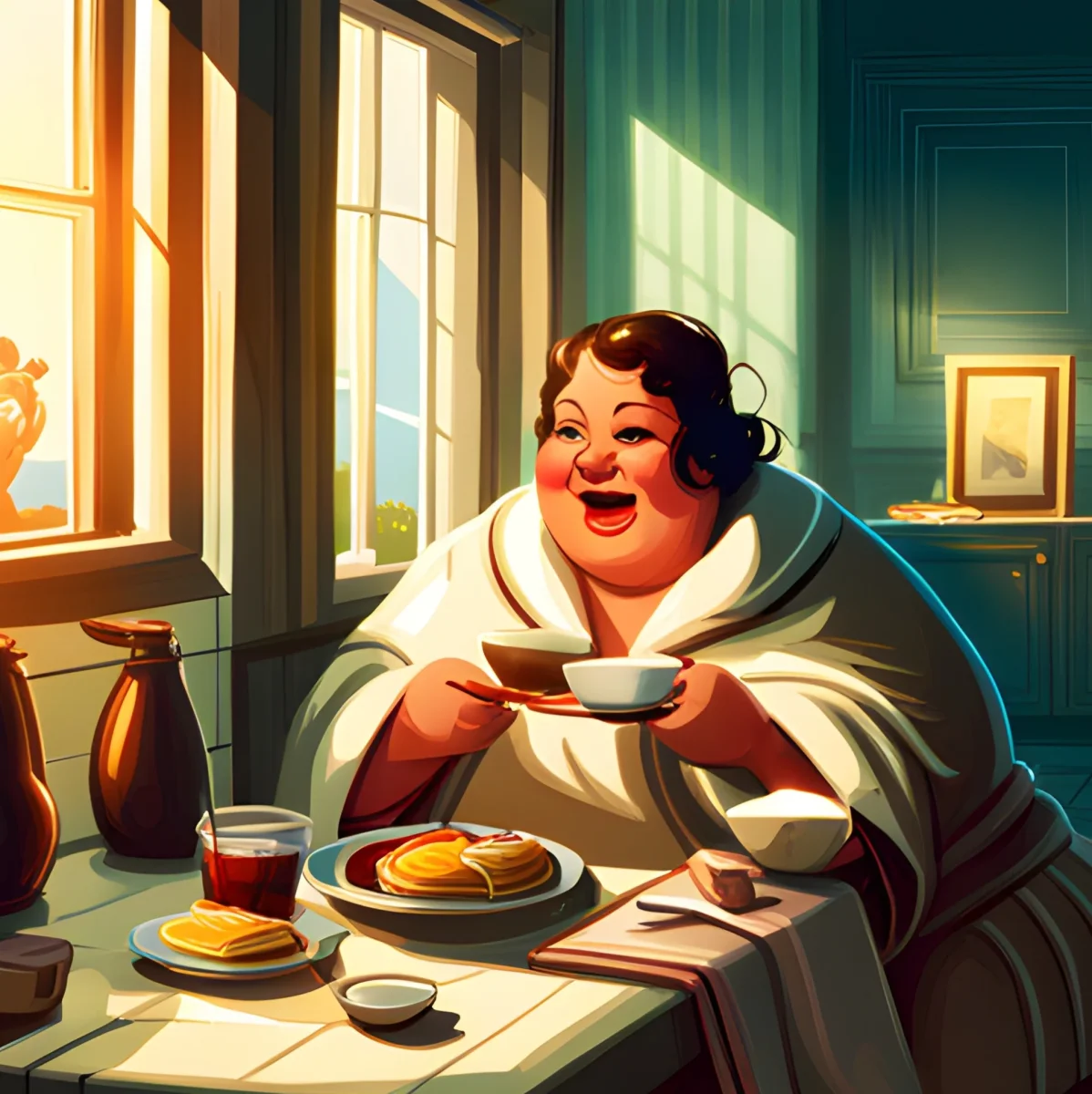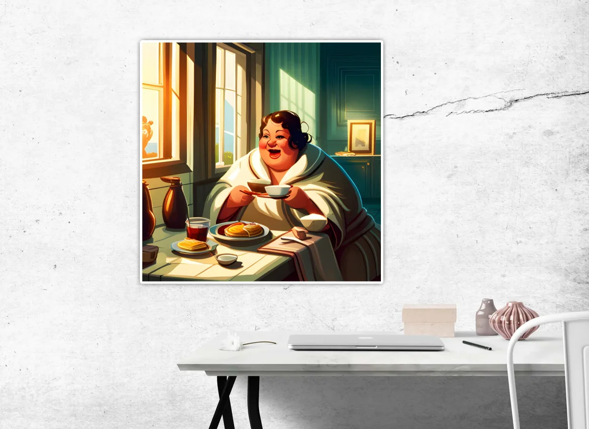 Deze vrolijke diamond painting uit de populaire “Dikke Dames”-serie straalt pure levensvreugde en gezelligheid uit! Een dame geniet stralend van haar ontbijt bij het ochtendlicht 🌞 — met een dampend kopje koffie ☕, een stapel pannenkoeken 🥞 en een brede glimlach van oor tot oor 😄. De warme kleuren, ronde vormen en sfeervolle details maken dit tafereel een feest om te zien én te maken.