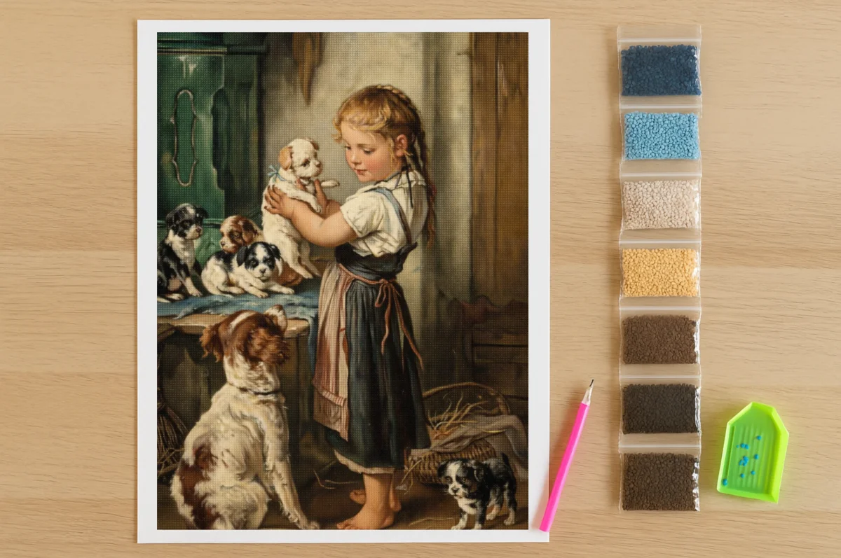 Een schattige scène waarin een jong meisje liefdevol een puppy vasthoudt, omringd door meerdere andere speelse puppy’s en een waakzame moederhond. De warme, landelijke sfeer en zachte kleuren maken dit een hartverwarmend tafereel – perfect voor een betoverende diamond painting.