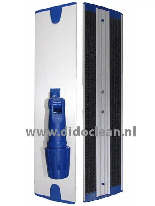 Het frame is gemaakt van een degelijk aluminium met een stevig kunststof verbinding. Aan de onderzijde van het vlakmop frame bevinden zich velcro strips (klittenband strips) waardoor het frame uitstekend geschikt is voor alle velcro vlakmoppen en microvezel vlakmoppen. Een duurzaam vlakmopframe van professionele kwaliteit!