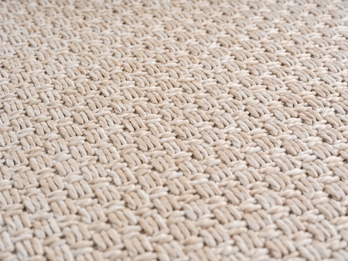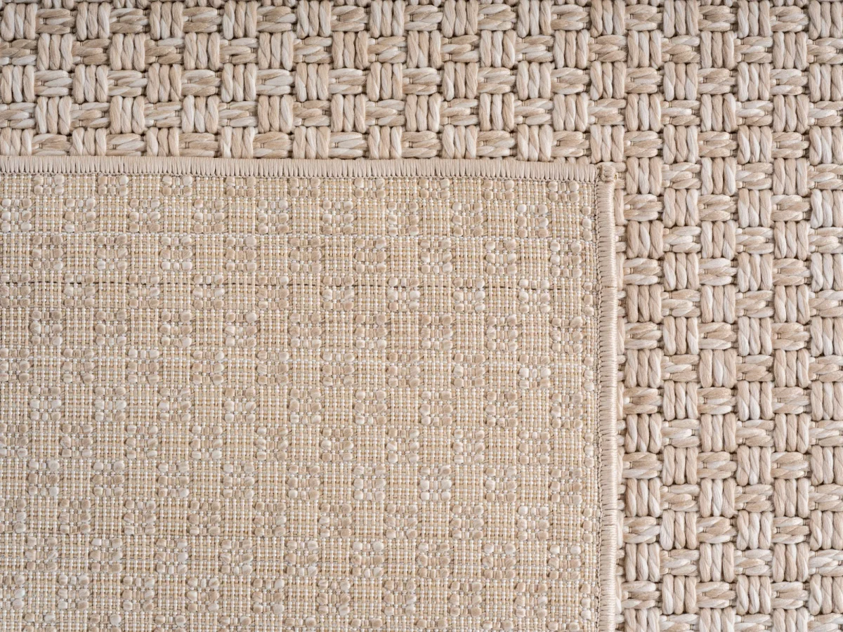 De rug is gemaakt van gefibrilleerd garen, wat zorgt voor extra duurzaamheid en een lange levensduur. Het tijdloze beige design met subtiel patroon maakt dit vloerkleed een veelzijdige toevoeging aan elk interieur of terras.