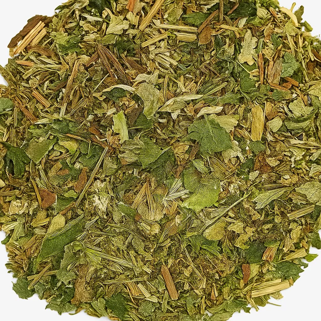 Ingrediënten: kersenstelen, heermoes, varkensgras, witte dovenetel, lijnzaad, berendruifblad, selderijblad, kattenpoten.