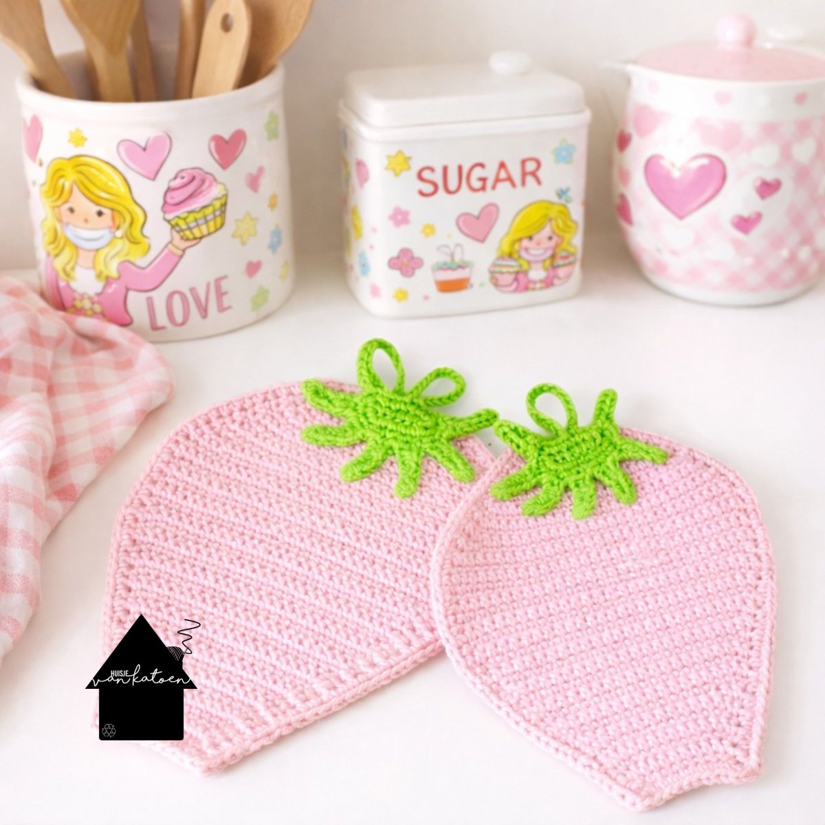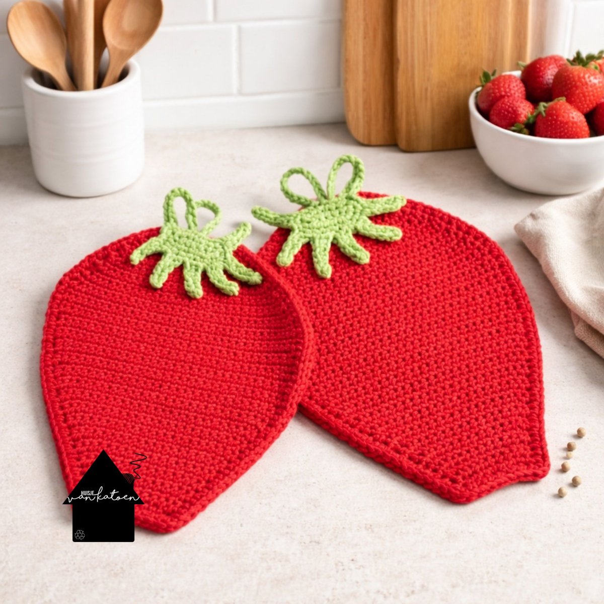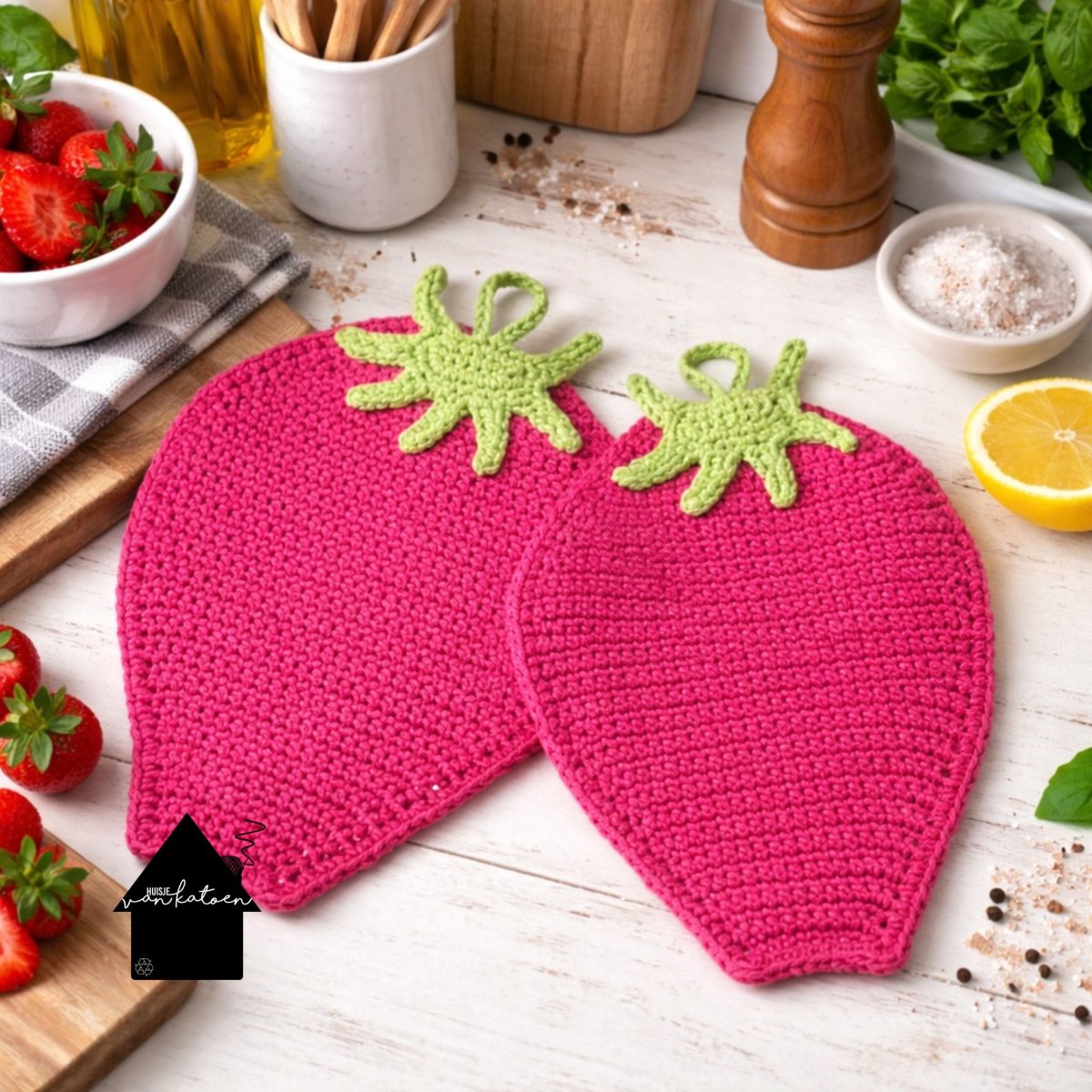 Ga je een project haken dat je later wilt wassen? Maak dan eerst een klein proeflapje en was dit op de temperatuur die jij van plan bent te gebruiken. Ons garen bestaat voor ongeveer 20% uit andere vezels, waardoor we vooraf niet kunnen voorspellen of (en hoeveel) het krimpt. We hebben zelf twee vaatdoekjes in verschillende kleuren getest op 60 graden: eentje werd ongeveer 1 cm kleiner, de ander helemaal niet. Bij deze pannenlappen raden we daarom aan om een proeflapje te haken met alle twee de kleuren en dit mee te wassen. Dan weet je precies wat je kunt verwachten… en kom je niet voor verrassingen te staan. Kleine moeite, groot plezier