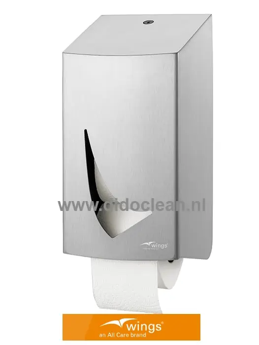 Wings 2-rols Toiletrolhouder voor standaard toiletrollen met cilinderslot. Met kenmerkende schuin aflopende bovenzijde en grote Wings uitsparing voor inhoudscontrole. De kokers van de toiletrollen zitten om 2 kunststof assen, die zorgen voor automatische toiletrolwisseling. De Assen blijven met lege kokers in de dispenser zitten. Modulair systeem.
