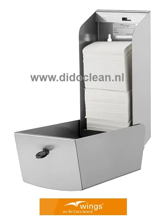 Wings Bulkpack Toilet Tissue Dispenser RVS Voor wandmontage. Voorzien van cilinderslot en Wings sleutel. Met geïntegreerde ovale opening voor perfecte en eenvoudige uitname van de tissues. Met kenmerkende schuin aflopende bovenzijde en Wings venster voor inhoudscontrole links onderaan.