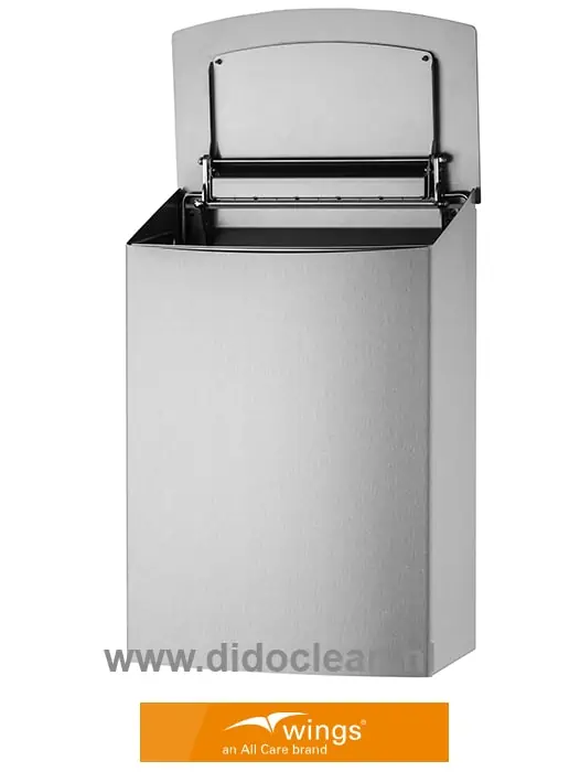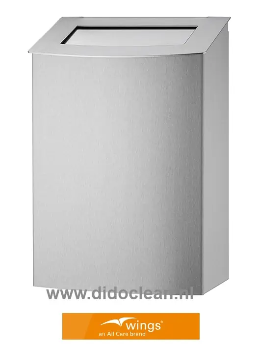 Wings RVS Afvalbak 20 liter gesloten met push deksel en binnenring. Met kenmerkende schuin aflopende bovenzijde en Wings venster links onderin. Met ingenieus systeem, waarbij tijdens het verwisselen van de zak de deksel aan de bak blijft zitten.