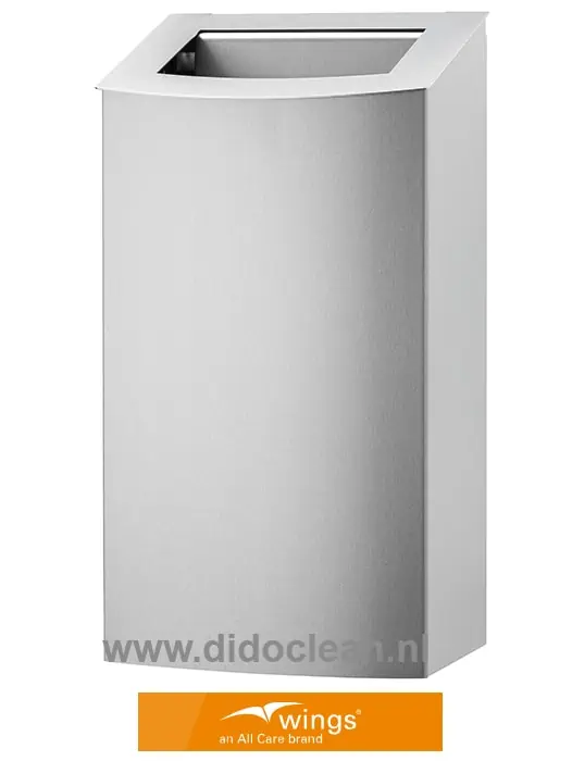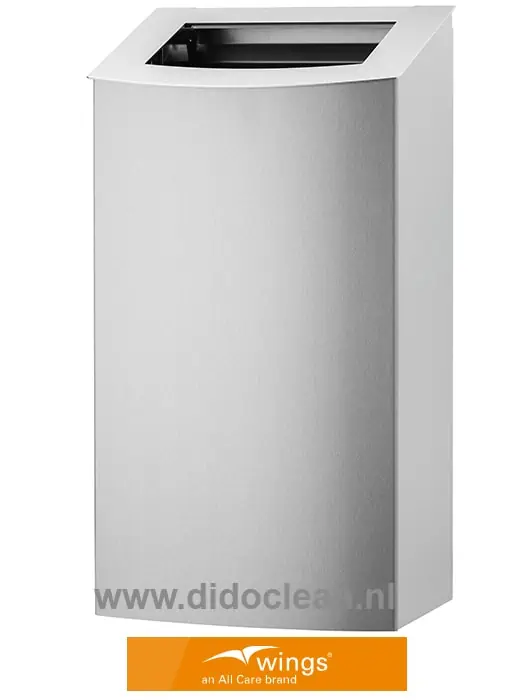 Wings RVS Afvalbak open 56 liter met binnenring. Met schuin aflopende bovenzijde. Met ingenieus systeem, waarbij tijdens het verwisselen van de zak de deksel aan de bak blijft zitten.