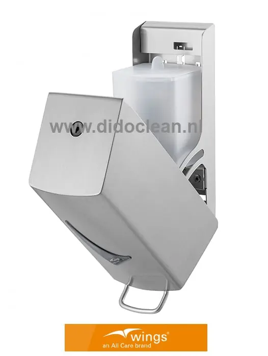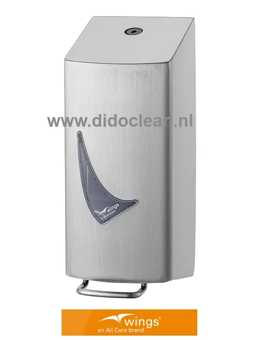 Wings RVS Spraydispenser en Toiletseatcleaner 400ml met universeel navulbaar reservoir. Modulair systeem. Geschikt voor wandmontage. Voorzien van cilinderslot en Wings sleutel. Uitvoering met RVS duwbeugel voor het doseren van de vloeistof. Kenmerkende schuin aflopende bovenzijde en Wings venster voor inhoudscontrole links onderaan. Navulreservoir met een inhoud van 400ml en spraypomp geschikt voor vloeibare (spraybare) handzeep/handcleaner, Handalcohol en Toiletbrilreiniger. Op aanvraag ook leverbaar voor gebruik met pouches/cartridges.