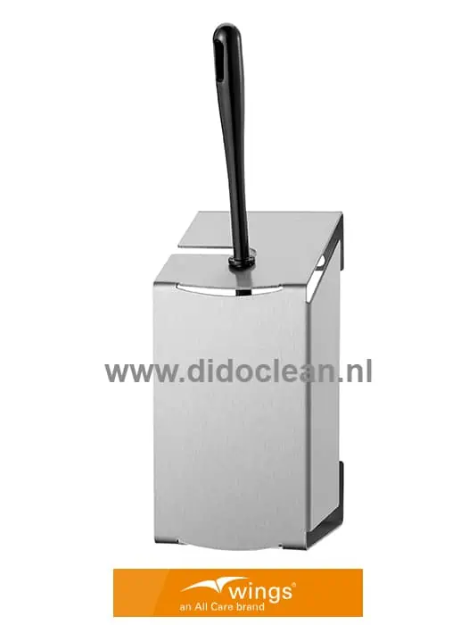 Wings Toiletborstelhouder RVS met één afgesloten zijkant. Met kenmerkende schuin aflopende bovenzijde. Standaard uitgevoerd met hygiënische zwarte toiletborstel en uitneembare kunststof wegwerp opvangschaal.