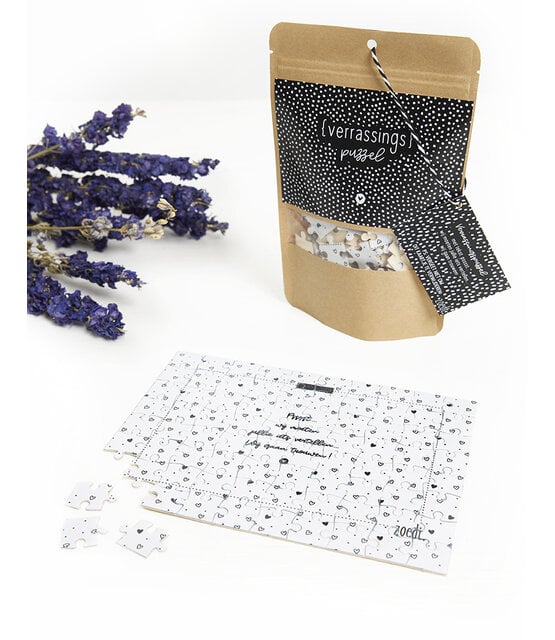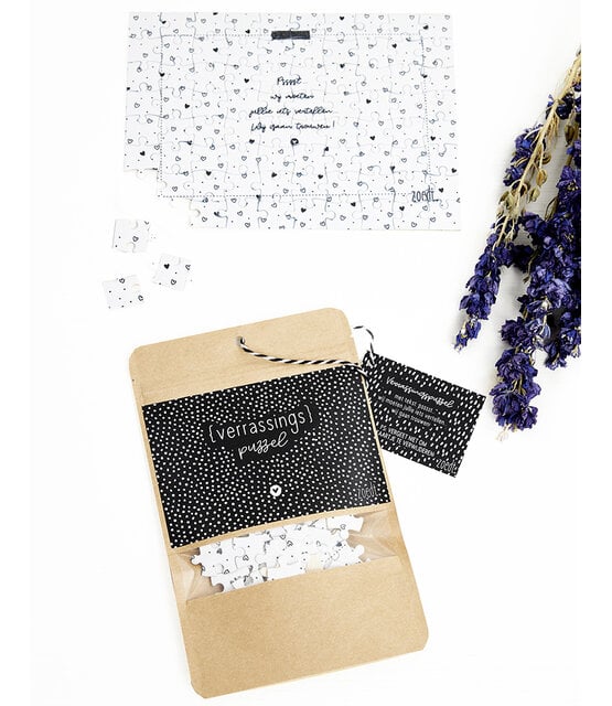 De puzzel is 20x 14,5cm en zit in een bruine kraft stazak met leuke zwart wit sticker. De puzzel heeft 80 stuks. Vergeet niet het kaartje weg te halen!